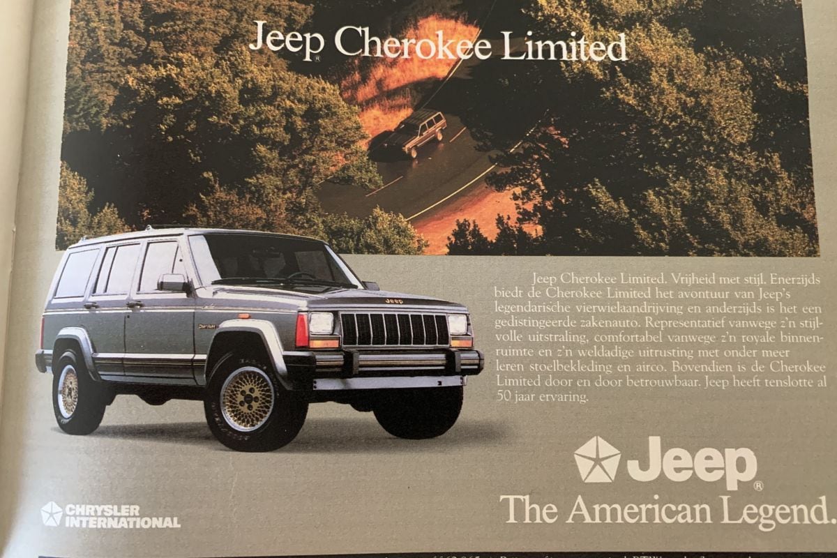 De Jeep Cherokee Limited: vrijheid met stijl. Voor een luttele 86.250 gulden (!) staat hij in 1990 op de oprit. De Cherokee heeft dan wel én vierwielaandrijving én luxe voorzieningen als leren bekleding en airco. Iets minder te besteden? Twee pagina's verder staat een advertentie van een Opel Kadett Caravan! "Hoeveel ruimte geeft u uw gezin?" Een werkpaard met veel binnenruimte, wat zoekt een mens nog meer?