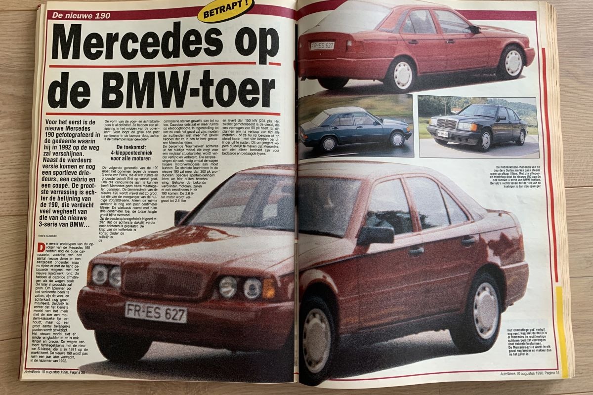 'Mercedes op de BMW-toer'; daarmee worden de nieuwspagina's groots geopend. Voor het eerst wordt de opvolger van een nieuwe Mercedes-Benz 190 vastgelegd op de gevoelige plaat. We spreken halverwege 1990 dan ook nog van een nieuwe 190, maar de geschiedenis leert dat het om de eerste C-klasse gaat waarmee we hier voor het eerst kennismaken. Die C-klasse wordt uiteindelijk vanaf 1993 geproduceerd. In 1990 wordt al druk gespeculeerd over verschillende carrosserievormen, waaronder een cabriolet. De komst van een open C-klasse volgt echter pas bij de W205-serie die sinds 2014 rondrijdt. Naast de 'nieuwe 190' wordt ook een frisse instapversie van de Daihatsu Charade behandeld. Het gaat om de Fellow-versie waarbij op subtiele wijze kosten zijn bespaard, zoals door het ontbreken van een hoedenplank.