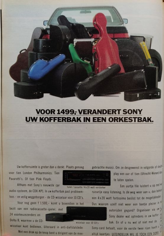 Een goede geluidsinstallatie, dat leek in de jaren 90 belangrijker dan nu. Ook in de auto was het sommigen veel geld waard. Goed geluid, daar gaf je graag geld aan uit. Het liefst wilde je dan ook nog een beetje gevarieerde muziek beluisteren en dat was 30 jaar geleden ingewikkelder dan nu. Voor 1.500 gulden kreeg je echter een CD-wisselaar voor 10 CD's én een radiocassettespeler van Sony. Als ze toen toch eens wisten dat dat op den duur af fabriek heel normaal zou worden.