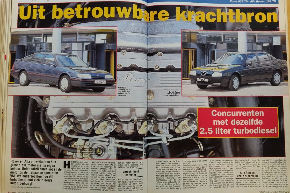 De CRX en MR2 waren weliswaar nieuw al liefhebbersauto's, maar dat gold niet voor deze twee andere auto's die in een vergelijkende test de strijd aangingen met elkaar. De Rover 825 en Alfa Romeo 164 (vooral die laatste) bereikten die status pas veel later. Dat wil zeggen; je moet bovenal een liefhebber zijn om er eentje op de weg te houden. Het beste uit de geschiedenis van de auto-industrie waren ze allebei niet. Dat lag in ieder geval niet aan de motor; de grote gemene deler van deze twee auto's. De van VM Motori afkomstige turbodiesel staat niet per se als slecht te boek. Hoewel beide motoren in beginsel iedentiek waren, constateerde de testredacteur nogal verschillende karakters. In de Rover had de 2,5-liter turbodiesel een betrekkelijk korte vermogensbandbreedte, terwijl het blok in de Alfa Romeo juist meer lineair door bleef sleuren tot in de hoge toeren. In de Alfa was overigens ook minder getokkel te horen.