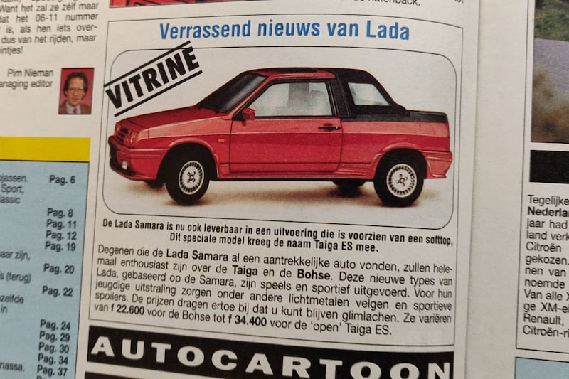Eigenlijk is er maar één nieuwtje dat direct de interesse wekt als we AutoWeek 45 uit 1990 nog eens openslaan. Lada kondigde namelijk aan dat er een nieuwe open versie van de Samara kwam. De Samara werd hier weliswaar behoorlijk verkocht, toch is het een auto waarvan we ons kunnen voorstellen dat-ie aardig diep in het geheugen weg is gezakt. De reguliere Samara Cabriolet zal misschien nog wel wat zeggen, maar deze Taiga moet toch wel van heel ver komen. Met zijn extra 'sportieve' bumperwerk, bijzondere koplampen en een stoffen kap achter het stalen dak was het een bijzondere haast landaulet-achtige verschijning. Kende jij 'm nog?