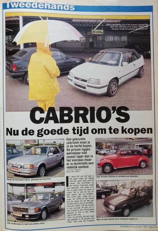 Sommige adviezen uit 1990 gaan nog altijd op. Ze brachten we destijds in een reportage onder de aandacht dat het najaar de beste tijd is om een cabriolet te kopen. Dat lijkt vanwege het weer natuurlijk niet zo'n lekker plan, maar het heeft alles met het aanbod te maken. In het voorjaar zoeken er simpelweg meer mensen naar en is een deel van de vroege vogels al verkocht. We lichtten daarom een aantal interessante opties uit op de occasionmarkt. Zo was de Ford Escort MK4 Cabrio een 'keurige keuze' en was een 'verrassend elegante' open Opel Ascona ook interessant. Wie het liever iets spectaculairder had, kon bijvoorbeeld kijken naar een Porsche 914 of een jong gebruikte Mazda MX-5.