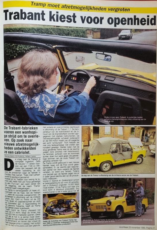Wie terugdenkt aan 1990, denkt ongetwijfeld ook terug aan de Duitse eenwording op 3 oktober van dat jaar. Daarmee kwam het DDR-erfstuk Trabant uiteraard in zwaar weer terecht. Om toch nog het hoofd boven water proberen te houden, kwam Trabant daarom met de enigszins ongelukkig genaamde Tramp. Een open Trabant met een stoffen kap en deuren. Een beetje zoals de Citroën Méhari dus. In de neus lag inmiddels een Volkswagen-motor, want het westen bleek op dat gebied toch wel echt wat verder te zijn. De Tramp kon het tij echter niet meer keren. Nog geen halfjaar na onze test met het gele ding liep de laatste Trabant van de productielijn.
