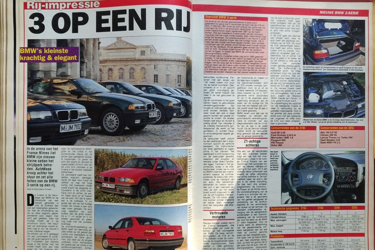 Eind november 1990 hadden we het genoegen om voor het eerst met een auto te rijden die daarna jarenlang onlosmakelijk met het straatbeeld verbonden zou blijven: de BMW 3-serie E36. Qua design was dat destijds een enorme sprong ten opzichte van de E30. Ook de eerste indruk bij het rijden was goed. Het motto 'Freude am Fahren' kwam volgens de testredacteur 'in volle glorie tot uiting' in de E36. Dat de prijs ten opzichte van zijn voorganger ook een sprong had gemaakt, was dan ook geen schande.