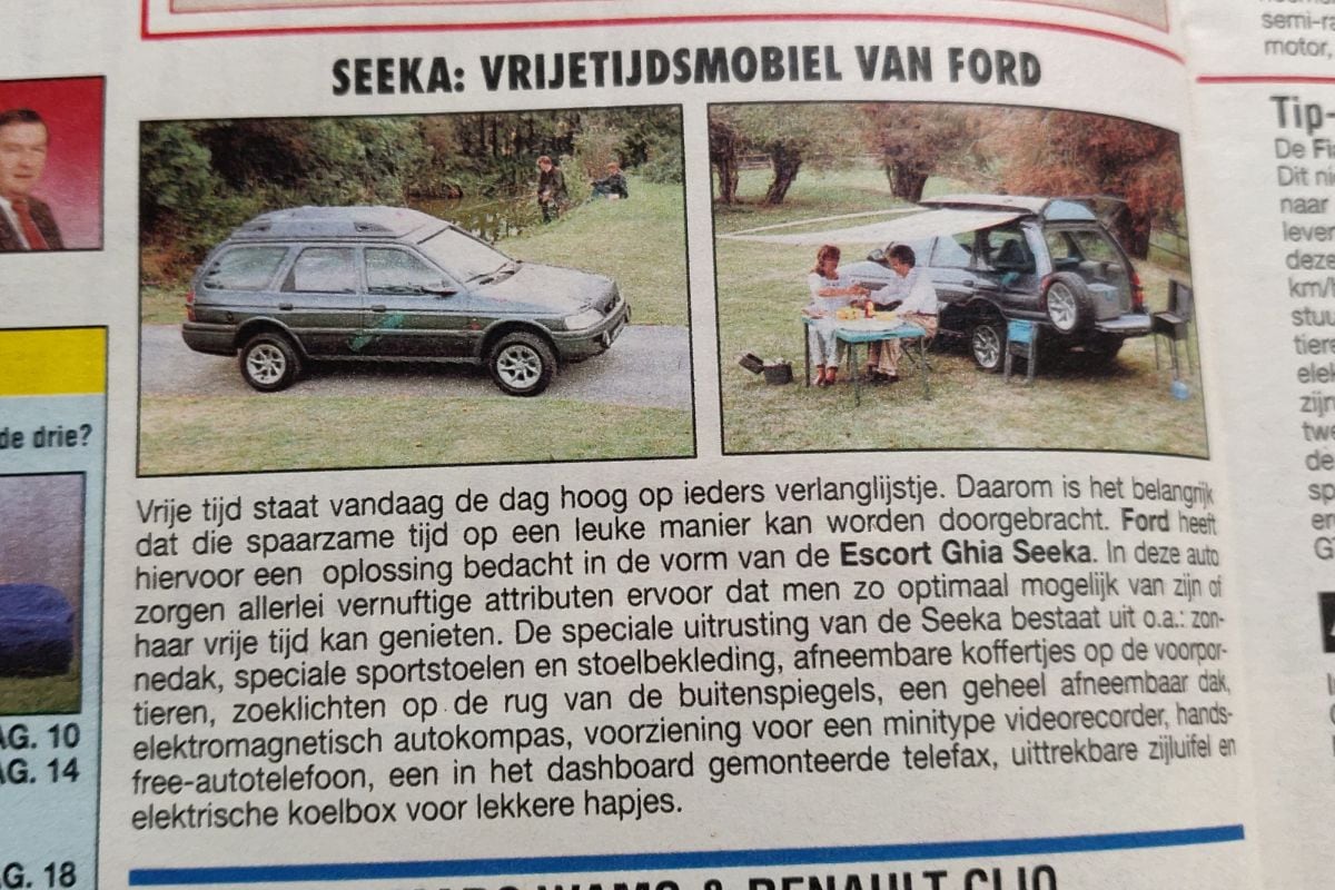 De Ford Escort Clipper was een auto waarmee tal van gezinnen in de jaren 90 op vakantie gingen, maar eenmaal op de camping aangekomen zat het werk voor de Ford erop. Dat de auto echter ook zelf prima als verlengstuk van het kampeerplezier gebruikt kon worden, wilde men laten zien met de Ghia Seeka Concept. Een Escort die voorzien was van allerlei zaken om het gemak te dienen. Zo had-ie onder meer een zonnescherm, een koelkast, een zonnedak én stond-ie hoger boven de grond. Zo kon je ook makkelijker overal komen. De belangrijkste optie was zonder twijfel de telefax!