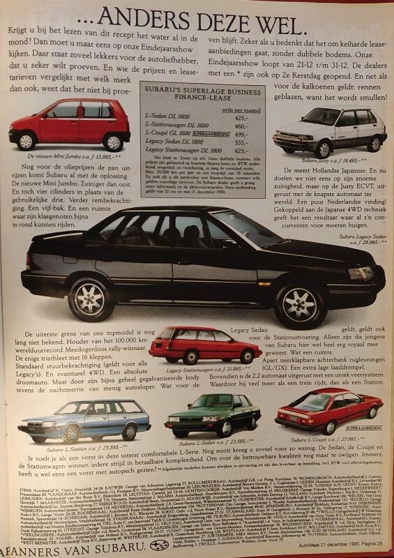 Tegenwoordig kun je bij Subaru in Nederland aankloppen voor de XV, de Forester en de Outback. Drie avontuurlijk ingestelde auto's die ruwweg dezelfde vorm volgen. In 1990 was het aanbod van het Japanse merk nog een stuk diverser, zo blijkt wel uit deze advertentie. Kijk die Mini Jumbo eens!