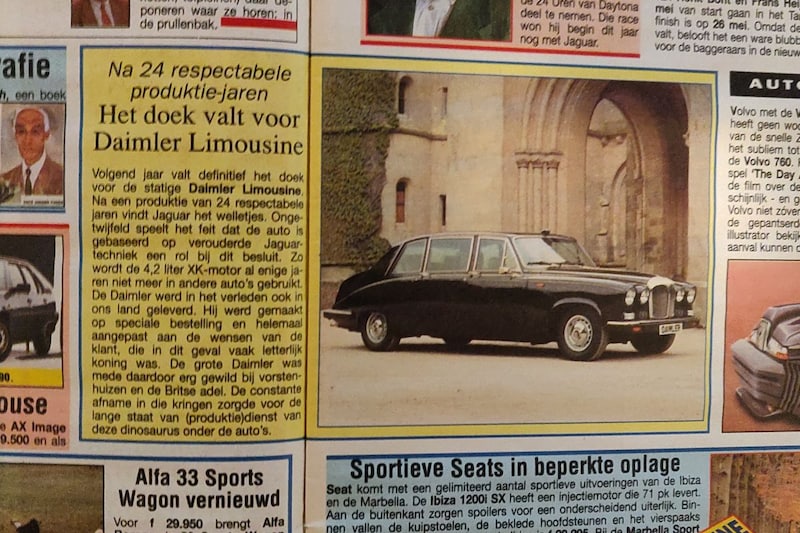 Het laatste nummer van 1990 was geen lichtpuntje als het ging om hard nieuws, maar op de nieuwspagina's viel één nieuwtje toch wel op. De Daimler Limousine (ook bekend als DS420) ging namelijk uit productie. Na 24 jaar om precies te zijn. De statige Daimler was in 1990 dus al flink op leeftijd en dat was 'm ook wel aan te zien. Toch moet het voor diverse vorstenhuizen wel een teleurstelling zijn geweest, want het uiterst luxe Britse slagschip was zeer geliefd onder de regenten van tal van landen. In 1990 begonnen de jaren echter te tellen, niet alleen vanwege zijn uiterlijk, want de eind jaren 60 geïntroduceerde Daimler stond immers nog op de basis van de Jaguar Mk10, de voorloper van de Jaguar XJ. Uiteindelijk liep pas in 1992 werkelijk de laatste van de band. Eén van de laatste vier ging naar koningin Elizabeth, een andere naar haar moeder.