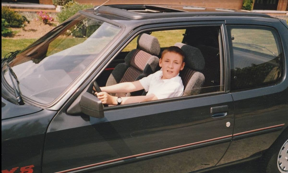John als twaalfjarige achter het stuur van de toen nog kersverse Peugeot 205.