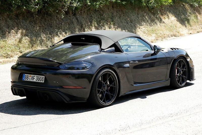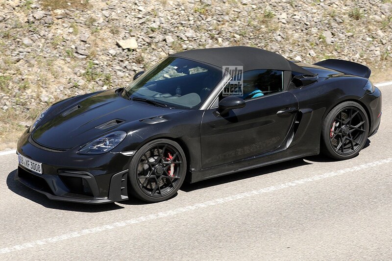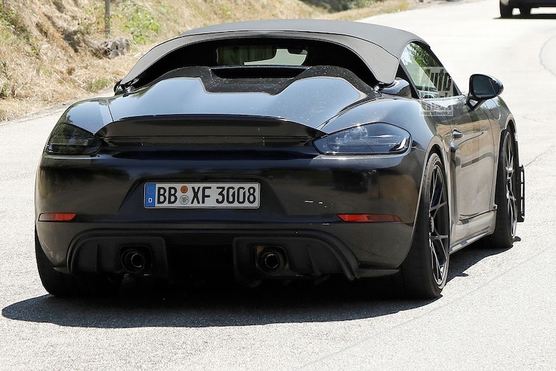 De RS-behandeling beslaat meer dan slechts de komst van een krachtigere motor. Zo krijgt de 718 Spyder RS net als de GT4 RS diverse aerodynamische extraatjes. We konden je de 718 Spyder RS al eerder laten zien, al betrof het toen nog niet het definitieve model. Op deze nieuwe spionagefoto's is al het extra spoiler-, lipjes- en randjeswerk van de partij en is het stoffen dakje in zijn definitieve vorm gemonteerd. Daarnaast monteert Porsche vanzelfsprekend aangepaste dempers, veren, stabilisatorstangen en een extra krachtig remsysteem.
