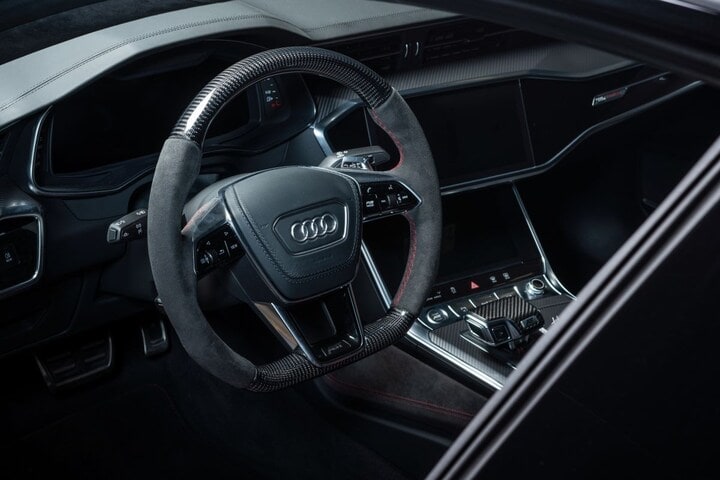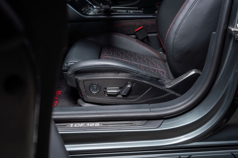 Zoals de foto’s verder verklappen, wordt het uiterlijk van de RS7 hier en daar nog wat extra aangezet. Neem de al brede voor- en achterbumper, sideskirts en spiegelkappen. Alle onderdelen worden voorzien van met rood geaccentueerde opzetstukken voor een betere aerodynamica. De wielen zijn 22 inch groot. Binnenin wordt op vrijwel elk denkbare plek met carbonfiber gewerkt.