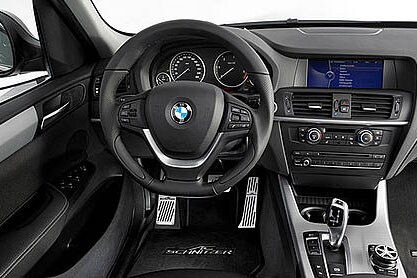 Uiterlijk heeft AC Schnitzer natuurlijk ook het één en ander in de aanbieding voor de X3. Naast een dikker aangezette voor- en achterbumper is ook aan een dakspoiler gedacht. Binnenin kan gekozen worden voor een sportstuur en aluminium sportpedalen en de iDrive knop kan vervangen worden door een knop die lijkt op een sportvelg. Daarover gesproken: het pronkstuk op visueel gebied is het assortiment aan (grote) velgen die de Duitsers op verzoek monteren. Het begint bij 18" sloffen, maar voor wie wil (en durft) gaat de lijn door naar 22 inch wielen die bovendien in twee kleuren zijn uitgevoerd.