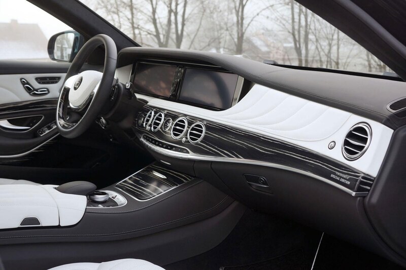 Uiterlijk onderscheidt de sinistere S-klasse zich met koolstofvezel lipjes, en ook de dakspoiler is van dat materiaal gemaakt. We komen het lichtgewicht goedje verder tegen op de spiegelkappen en aan de voor- en achterbumper. 22-inch lichtmetaal met een turbine-achtige uitstraling hoort bij het pakket. Vanbinnen is het dankzij de deels witte bekleding een wat minder duistere boel.