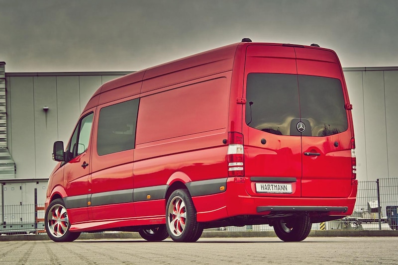 Een Mercedes-Benz Sprinter is nu niet bepaald het meest geliefde hapje voor tuners, maar het Duitse Hartmann heeft zich toch aan de besteller gewaagd. We zien een flinke bus met een complete bodykit die de Sprinter meteen een stuk dichter boven het asfalt lijkt te brengen. Mistlampen in de voorbumper mogen natuurlijk niet ontbreken; hetzelfde geldt voor het weinig subtiele tweekleurige Zaro-lichtmetaal in de maat 20 inch.