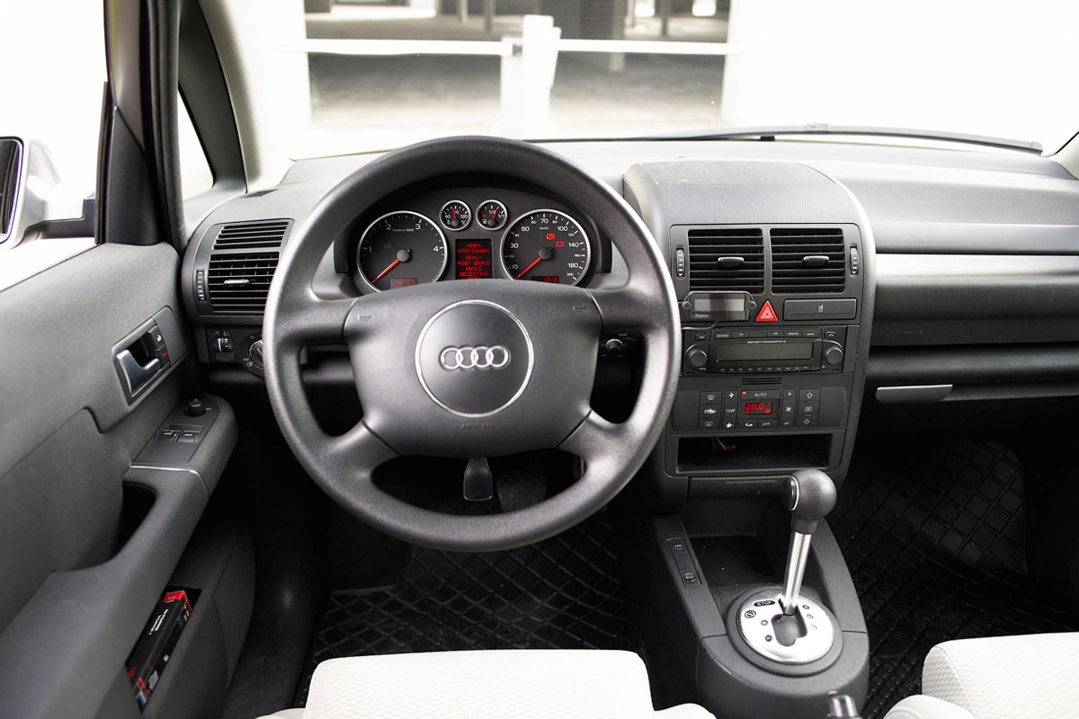Voor zijn beperkte afmetingen biedt de Audi A2 overigens verrassend veel interieurruimte. DeA2 is hoger dan een gewone hatchback. Daardoor lijkt hij vrij smal, terwijl-ie in werkelijkheid breder is dan een Polo uit die tijd. Andere opvallende zaken zijn de motorkap en de achterklep. Die eerste kan eraf, maar blijft in principe dicht. In plaats daarvan is er een serviceluik op de plek van de grille, waar je alle vloeistoffen kunt checken en bijvullen. De achterklep loopt tot ver in het dak door. Eigenlijk is alles bijzonder aan deze Audi; het had zomaar een Citroën kunnen zijn…