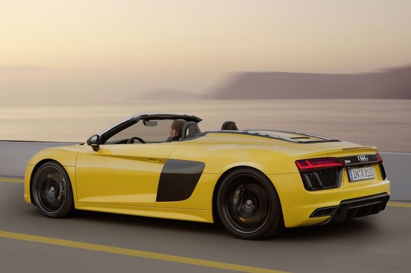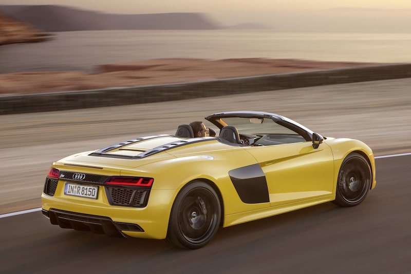Zelfs het 'achterdek' lijkt met z'n twee in uitstroomopeningen in lengterichting sterk op dat van z'n voorganger. Onder die roosters vinden we de bekende 5,2-liter V10 die ook in dit geval 540 pk ophoest. Van 0-100 gaat in 3,6 seconden en bij de topsnelheid van 318 km/h kun je beter niet je hoofd boven de voorruit uitsteken. De R8 Spyder weegt 1.612 kg en is daarmee 42 kg zwaarder dan de dichte variant.