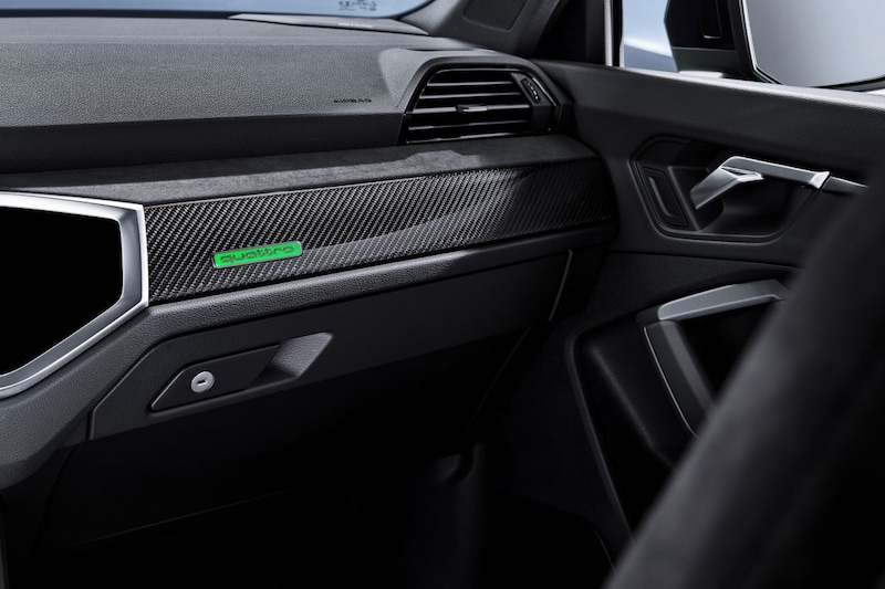 Optioneel levert Audi een sportuitlaatsysteem dat niet alleen extra bruut moet klinken, maar ook nog eens voor een kleine gewichtsbesparing zorgt. Het nieuwe RS-tweetal staat standaard op 20-inch lichtmetaal, maar 21 inch is leverbaar voor wie bereid is daar de portemonnee voor te trekken. De remmerij is standaard al van een hoger kaliber dan bij de normale Q3’s en wie het wenst kan zijn stalen schijven laten vervangen door koolstofkeramische exemplaren.