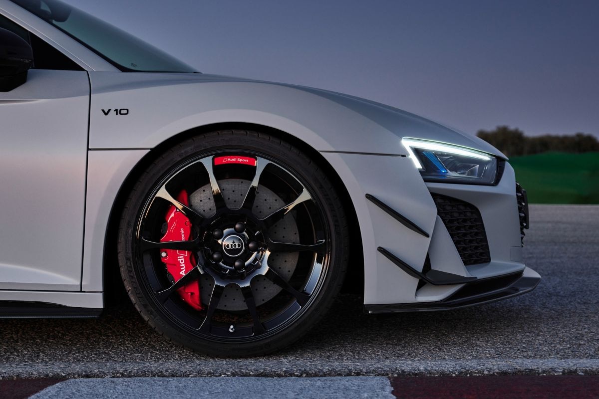 Dat is met name te danken aan de speciaal voor deze versie ontworpen lichtgewicht 20-inch wielen, die samen met keramische remmen tot de standaarduitrusting van de R8 V10 GT RWD behoren. Behalve aan die wielen herken je de nieuwe topversie aan zwarte (GT-)badges, zwarte kleppendeksels en de standaard aanwezige 'aerokit' van koolstofvezel.