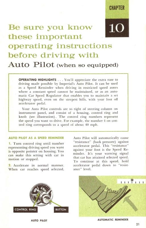 Maar goed, een patent is leuk, het zou nog tot 1958 duren voor bij Chrysler de eerste auto met ‘zijn’ cruisecontrol (onder de naam Auto Pilot) van de band loopt. Chrysler monteert het in de New Yorker en in de Windsor. Daarnaast ook in de Imperial, in die tijd een separaat merk van Chrysler waarmee de strijd wordt aangebonden met de exclusieve merken van die tijd als Cadillac en Lincoln. In Europa maken we pas vier jaar later kennis met cruisecontrol wanneer Mercedes-Benz het als Tempomat in productie neemt.