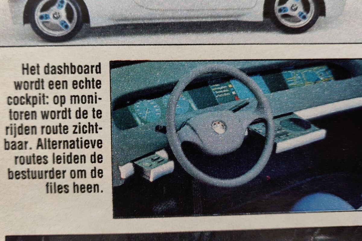 BMW had tevens een volledig elektrisch aangedreven stadsauto in de ontwikkelingsstudio staan (zie hierboven). Een conceptauto waar uiteindelijk in de praktijk weinig tot niets concreets van terecht is gekomen. Wat wél behoorlijk realistisch bleek, is wat er in het interieur gebeurde. Daarin troffen we namelijk een dashboard met iets voor die tijd heel bijzonders: een reeks schermen waarop je je te rijden route kon aflezen. Dat niet alleen: de auto voorzag je zelfs van alternatieve routes om drukke stukken te vermijden. We weten allemaal dat dat in de praktijk gekomen is met moderne navigatiesystemen die aan de hand van verkeersinformatie de optimale route voor je uitstippelen.