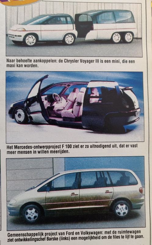 Een grote rol leek weggelegd voor de 'ruimteauto'. In de volksmond uiteindelijk beter bekend als de grote MPV. Onder meer Renault was daar al even mee op weg in 1991, maar de verwachting was dat meer merken met grote ruimtereuzen zouden komen. Meer mensen vervoeren per auto, zeker met carpoolende forensen. zou immers drukte op de weg schelen. Onder meer Mercedes-Benz zag er toekomst in, gezien de F100 Concept, maar ook Ford en Volkswagen. Die laatste twee hadden immers al een prototype ontwikkeld waar we ook al beeld van hadden in 1991 (zie hieronder). Op die foto is direct de Galaxy/Sharan te herkennen. Wat we toen nog niet wisten, is dat ook Seat aan zou haken met de Alhambra. De Mercedes-Benz F100 Concept kreeg geen direct productievervolg, al kun je de in 2005 gepresenteerde R-klasse tot op zekere hoogte zien als een model dat er inspiratie uit haalde.