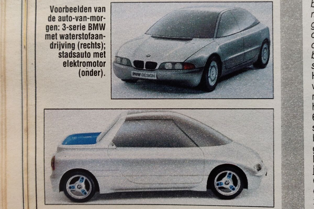 Op de foto daaronder zien we een 'waterstof-BMW' staan. Een auto die toen nog omschreven werd als een 3-serie, maar waarop duidelijk de neus van de in 1995 gepresenteerde 5-serie E39 te herkennen is. Over waterstof werd in 1991 dus ook al serieus nagedacht en nog altijd heeft BMW waterstof op de korrel als interessante energiebron. Het heeft alleen wat langer geduurd dan we in 1991 nog dachten.