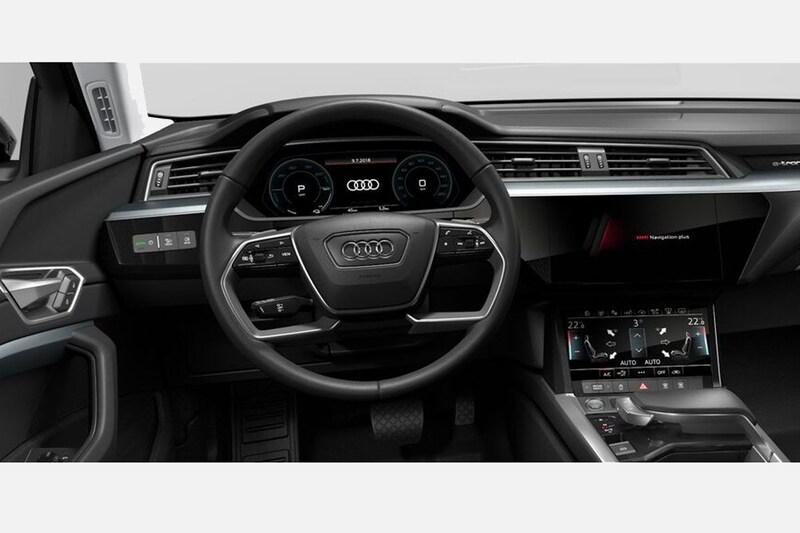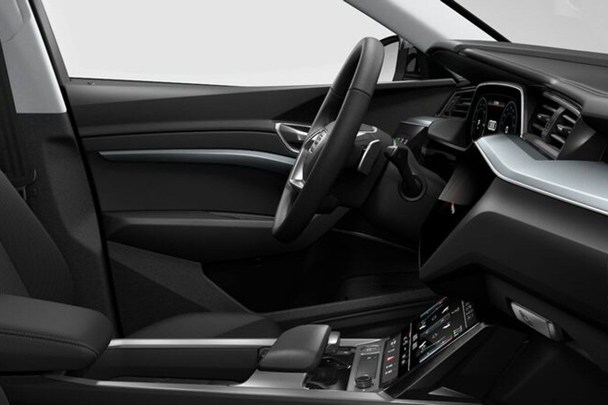 Ook het interieur is in standaardvorm een wat somber geheel. De standaardstoelen zijn met een zwart stofje bekleed, laten zich handmatig verstellen en zijn niet voorzien van ventilatie of verwarming. Het stuurwiel krijgt standaard vier spaken; in totaal is er keuze uit maar liefst zes verschillende stuurwielvarianten. Wie wil, kan zeker in het interieur lekker losgaan met de opties. Tal van leersoorten, stoelvarianten, hemelbekledingen en sierelementen worden aangevuld met opmerkelijke zaken als een verstelbare ‘comfortmiddenarmsteun’. Audi’s inmiddels bekende, nieuwe ‘touch-MMI’ geeft pas als er is bijbetaald de ‘haptische feedback’ waarover zoveel wordt gesproken en worden dan meteen in ‘glas-optiek’ uitgevoerd. Dat betekent dat de rij knoppen onder het onderste scherm optisch één geheel wordt met dat scherm, terwijl deze toetsen in de standaard E-tron duidelijk als zodanig herkenbaar zijn.