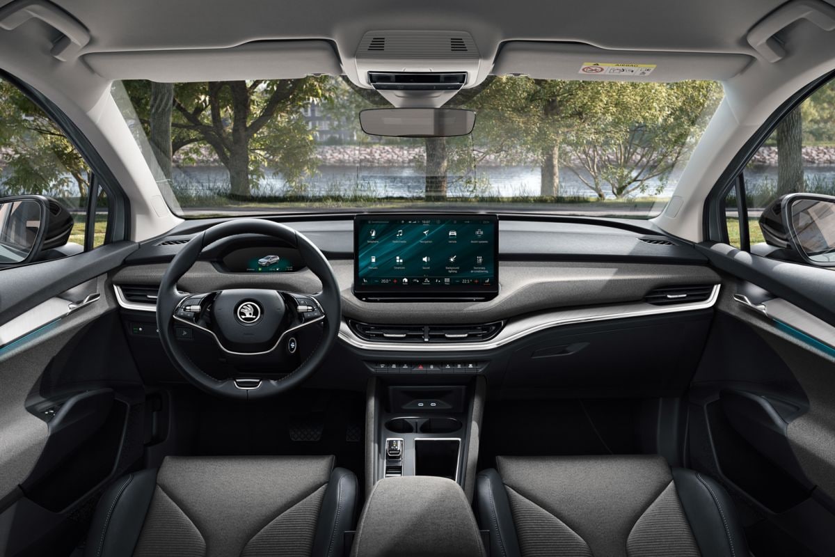 Het interieur van de Enyaq is standaard bekleed met een combinatie van stof en kunstleer. Naast de stoelen is ook een deel van het dashboard gehuld in stof, dat standaard een grijze kleur heeft. Optioneel is er ook een combinatie van leer en alcantara of volledig lederen bekleding te krijgen. Die stoelen zijn overigens handmatig verstelbaar. Om te zorgen voor wat extra sfeer kun je de sfeerverlichting in 10 kleuren instellen. Waar het verder bij producten van de Volkswagen groep doorgaans gebruikelijk is dat er voor de vanafprijs een kleiner scherm in het interieur wordt geschroefd, is dat bij de Enyaq allerminst het geval. Standaard krijg je gewoon het 13-inch scherm bovenop het dashboard. Navigatie, DAB+ en smartphonevoorbereiding zijn eveneens bij de prijs inbegrepen. Starten doe je met een druk op de knop, maar ontgrendelen moet wel met de sleutel.