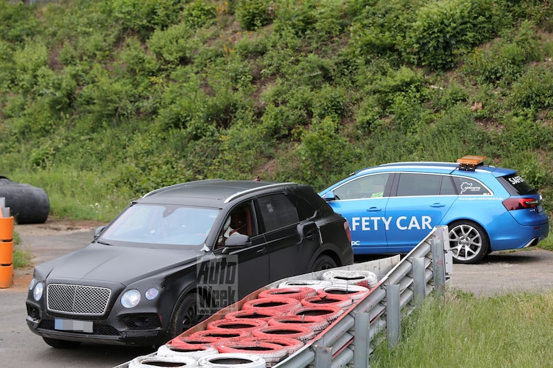 Onze fotograaf meldt dat het Bentley-prototype bij de zogenaamde 'Steilstrecke' stilviel. Ook de hulp van een safetycar mocht maar ten dele baten. Het lukte uiteindelijk om het prototype weer aan de praat te krijgen, maar tot meer dan een langzame roll of shame richting de pits was de Bentayga niet in staat.
