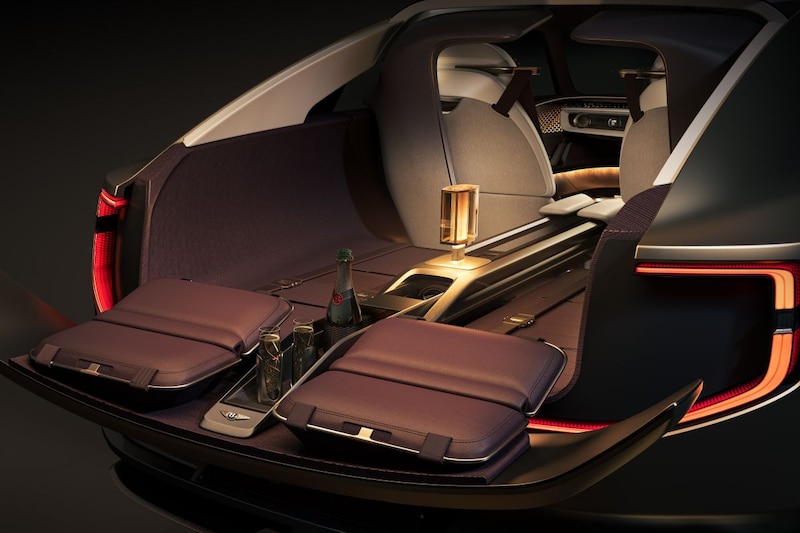 Minstens zo opvallend is de indeling van de auto. Het is namelijk geen twee-, vier- of vijfzitter, maar een driezitter. Dat verklaart ook waarom de EXP 15 slechts drie portieren heeft. Twee aan de linkerzijde, een aan de rechterkant. Een vleugje Hyundai Veloster dus, al zal Bentley dat nooit toegeven. Achter de bestuurdersstoel tref je twee door een helemaal naar achteren doorlopende middentunnel gescheiden stoelen aan. Het exemplaar dat zich niet direct achter de bestuurderstoel bevindt, is in lengterichting verschuifbaar. Bentley spreekt van een flexibel interieur waarin je je bagage en/of je hond eenvoudig mee kunt nemen. Opvallend: in de middentunnel die helemaal tot aan de achterklep reikt, tref je onder meer een wijnkoeler, glazen en een verschuifbare lamp aan. Gezellig.