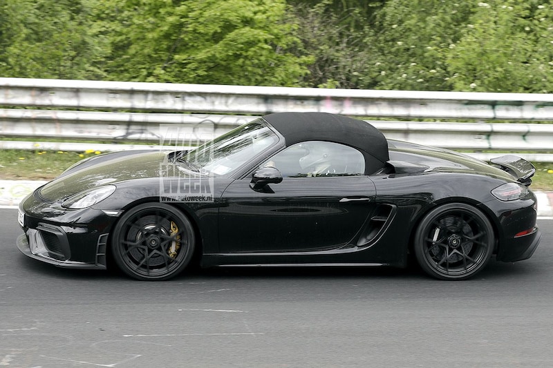 Dat betekent dat ook de na de 718 Cayman GT4 ook de 718 Spyder een RS-behandeling krijgt. De zwarte Porsche 718 Spyder die op de Nürburgring-Nordschleife langs de lens van onze spionagefotograaf is gereden verraadt zijn RS-genen vooral met een klein maar belangrijk detail achter de zijruitjes. Net als bij de 718 Cayman GT4 RS zitten daar extra openingen, ongetwijfeld om de potente krachtcentrale van voldoende koeling te voorzien. De overige RS-elementen ontbreken nog, maar reken er maar op dat ook de 718 Spyder een grotere achterspoiler en een verder extra aangezet uiterlijk krijgt.