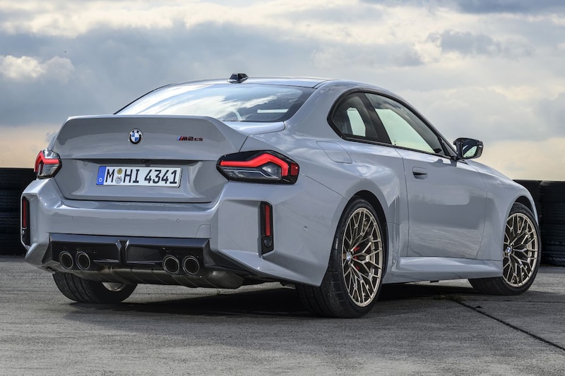 Verder heeft BMW onder meer de gasrespons aangepast, hangt er onder de M2 CS een nieuw uitlaatsysteem met kleppen én vier zwarte uitlaateindstukken en ligt de CS 8 millimeter dichter tegen het asfalt doordat veren en dempers zijn aangepast. M Compound-remmerij met rode klauwen is standaard, het M Carbon-keramische remsysteem is optioneel. Je herkent de M2 CS niet alleen aan zijn achterklep en uitbundigere spoilerwerk, maar ook aan zijn speciale M-wielen met Gold Bronze-kleurige afwerking. Aan de voorzijde meten ze 19 inch, achter zijn ze 20 inch groot. Eromheen zit standaard circuitrubber dat achter maar liefst 28,5 centimeter breed is.