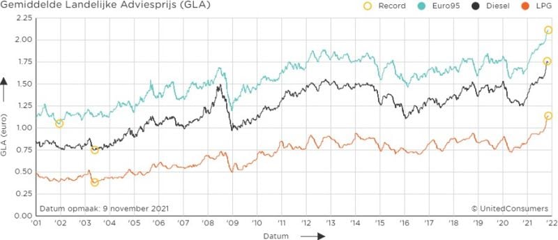 Brandstofprijzen (GLA) door de jaren heen. Bron: United Consumers