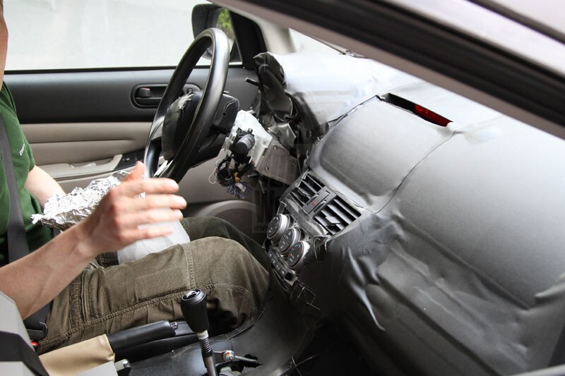 Voor het eerst kunnen we ook een blik ín de nieuwe auto werpen. Daar valt vanwege allerlei camouflagemateriaal ook nog niet echt veel te zien, maar in dit testmodel zien we veel onderdelen uit andere Mazda-modellen terug. Kijk maar naar de pookknop, de hendels in de deur, het aircocluster en het smalle informatiepaneeltje bovenop het dashboard. Er is duidelijk nog wel wat werk aan de winkel voor de engineers...