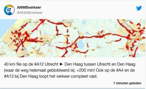 Om 9:00 uur stonden er volgens de ANWB nog steeds 184 files die samen goed zijn voor 849 kilometer. Op de A12 staan 13 files die samen 64 kilometer lang zijn; goed voor een vertraging van totaal 283 minuten! De grootste ellende lijkt voor de A12 tussen Utrecht en Den Haag te zijn voorbehouden. Om half tien staat daar volgens de ANWB nog +200 minuten vertraging.
