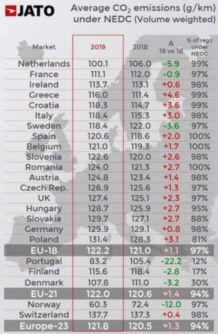 In 2007 bedroeg de gemiddelde CO2-uitstoot van de in Europa nieuw verkochte auto's 159,1 gram per kilometer (NEDC). Dat daalde jarenlang fors, tot in 2017 het laagste punt werd bereikt met 117,8 gram per kilometer (foto 2). Sindsdien is de trend omgekeerd en stijgt de gemiddelde CO2-uitstoot van nieuwe auto's juist weer. In 2019 kwam het volgens JATO uit op 121,8 gram per kilometer. Een stijging van 1,3 gram ten opzichte van 2018. We zijn in Europa weer bijna op het niveau van 2014 (123,3 g/km).