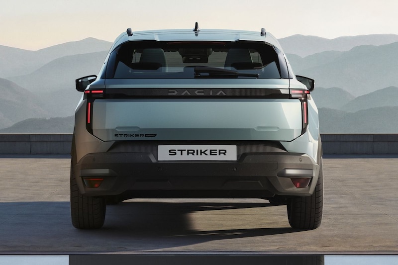 Met name aan de voorzijde is de Striker direct als Dacia herkenbaar. De hoekiger designtaal die op de huidige Duster werd geïntroduceerd en die ook de Bigster siert, komt tot uiting in no-nonsense bumperwerk met een handjevol vouwen en een rechte grille met bescheiden zilverkleurige sierelementen. Centraal erin het Dacia-logo en aan weerszijden ervan koplampen met in de bovenzijde een opgebroken stukje led-dagrijverlichting. Het is opvallend dat Dacia een verticale uitloper aan de koplamp heeft toegevoegd. Ook daarin zien we een stukje led-dagrijverlichting. Soortgelijke verlichting zien we aan de achterzijde. Daarnaast plakt Renault een verticaal led-element onder de verder horizontaal georiënteerde achterlichten. De achterlichten zijn aan elkaar geknoopt via een zwart kunststof element waarin de merknaam staat uitgeschreven. Hoe ruim de bagageruimte is die zich achter de achterklep schuilhoudt, weten we nog niet.