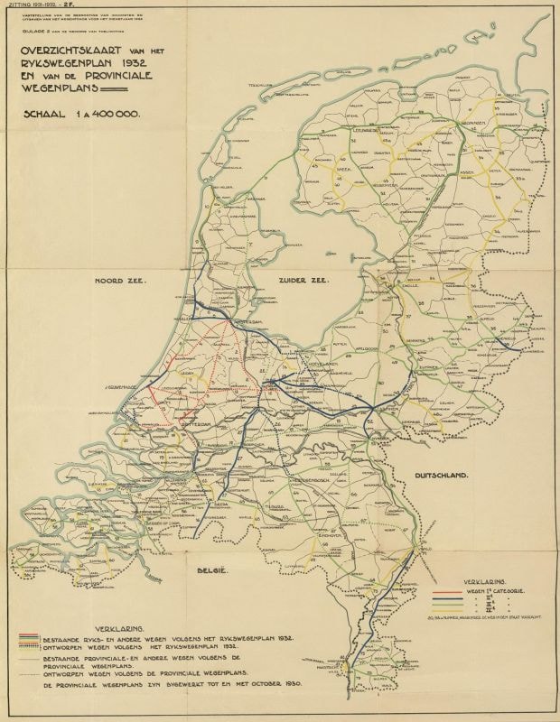 volstaat om de bestaande rijkswegen aan te passen met wat infrastructureel lapwerk. In 1928 rijden er 83.511 auto’s in Nederland, bijna achtmaal zoveel als in 1920. Het uit zijn voegen gebarsten verkeer vereist een grootscheepse implementatie van nieuwe wegtypes, die zijn berekend op de verkeersintensiteit van de toekomst. Al vrij snel begint de bouw van bijvoorbeeld rijksweg 13 Den Haag-Rotterdam, maar ook van