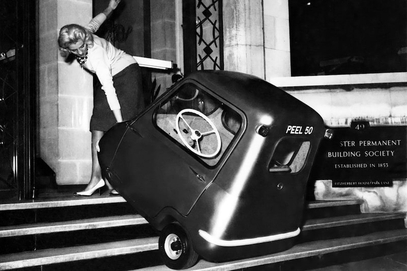 Waarom zien we dat? De Peel 50 was in in 1962 gelanceerd driewielertje dat de boeken is ingedoken als de kleinste in serie gebouwde 'auto' ooit. Het 49 cc kleine 2 pk sterke tweetaktmotortje van DKW gaf de 1,34 meter lange, 99 centimeter brede en 100 centimeter hoge 50 een topsnelheid van 61 km/h. Door zijn gewicht van 56 kilo moest het karretje eenvoudig met de hand te verplaatsen zijn. Deze foto's dienden ter illustratie van de 'praktische eigenschappen' van het concept.