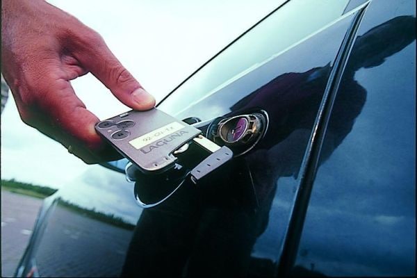 Met de komst van de Renault Laguna II maken we ook kennis met de Renault Card. Die is er in twee varianten. De goedkope Laguna’s krijgen er één die je met knoppen bedient, maar de dure Laguna’s hebben de handsfree versie. Die houd je gewoon in je zak, want de auto herkent ‘zijn’ kaart wanneer je in de buurt komt. Sensoren in de deurgrepen ontgrendelen de Laguna vanzelf zodra je de deurgreep vastpakt. Het trucje werkt ook andersom: wanneer je wegloopt, gaat de auto vanzelf op slot.