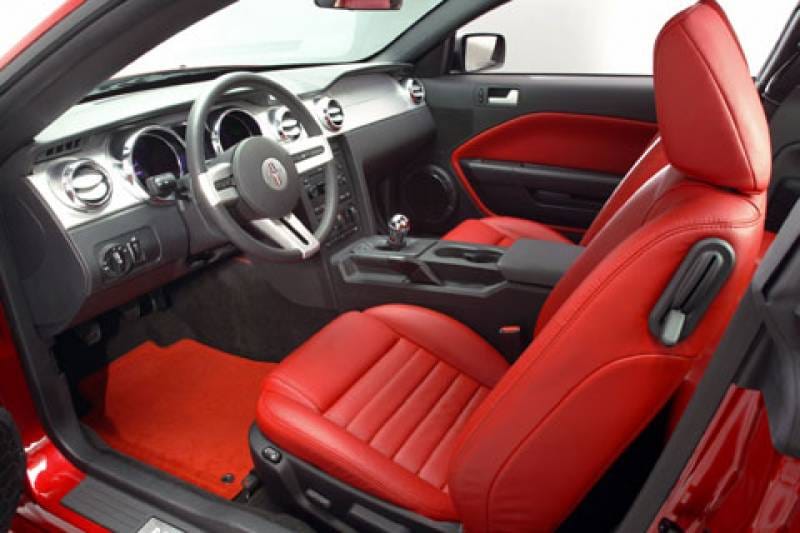 Het interieur van de nieuwe Mustang laat duidelijk zijn afkomst zien. Zo zien we verchroomde ringen rond de instrumenten en aluminium panelen. Een gimmick is de achtergrondverlichting van de instrumenten in het dashboard. De Mustang-eigenaar kan kiezen uit 125 verschillende verlichtingskleuren.