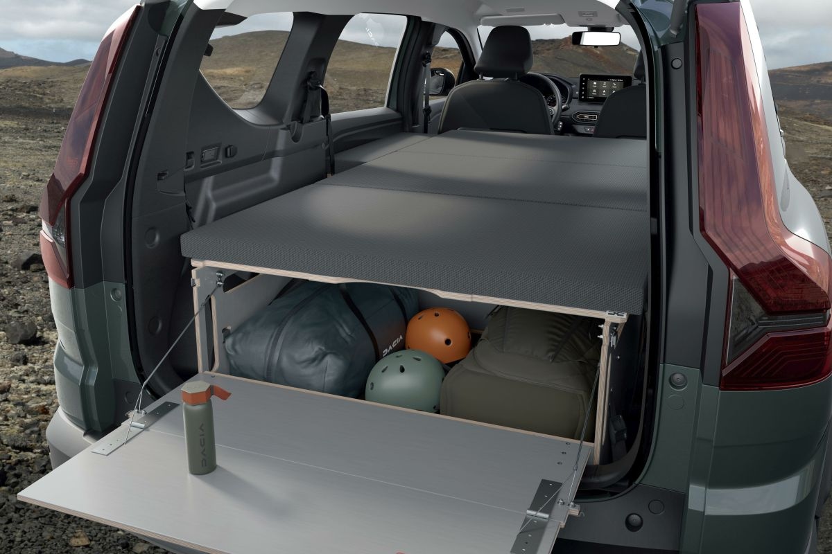 Let op: de volgende optie kost knaken. Gelukkig is de Dacia Jogger standaard niet al te duur, dus is er kans dat je geld overhoudt voor het Sleep Pack. Voor een lieve €2.181 levert de Dacia-dealer een speciaal voor de Jogger ontwikkelde houten box die je in de kofferbak verankert. Het ding is voorzien van een groot aantal scharnieren, waarmee je hem op inventieve wijze uitvouwt tot een perfect in de auto passend tweepersoonsbed. Het matras is eveneens opvouwbaar en gelukkig bij de prijs inbegrepen. Dat geldt niet voor een set matten waarmee je de ramen verduistert (€320) en een aan de auto vast te knopen tunneltent (€568,50). Helaas levert Dacia zo’n box niet voor de Spring – dat zou te geestig zijn.
