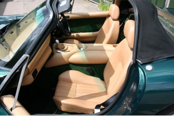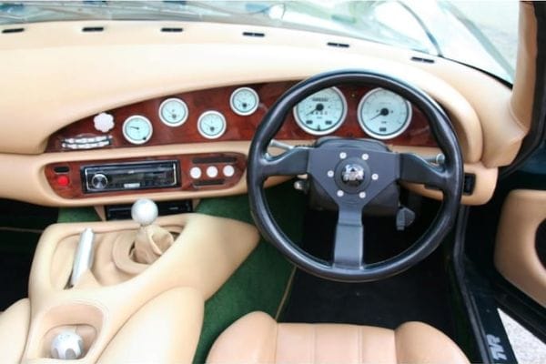 Met 235 pk is deze TVR Chimaera het zwakst gemotoriseerd van de drie geportretteerde occasions. EV-rijders zullen er wellicht om gniffelen, maar vergis je niet: dit is een bloedserieuze sportwagen die absoluut een vaardige hand vereist. Verantwoordelijk daarvoor is het relatief lage gewicht van de auto: net iets meer dan duizend kilo.