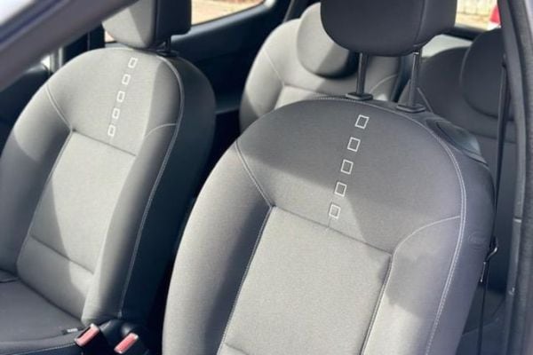 Binnenin treffen we veel grijs en harde kunststof aan, waarbij de gekleurde zijwangen van het meubilair en de vormgeving van het dashboard (met hier eveneens een ‘los’ geplaatste toerenteller) er een speels en voor dat segment acceptabel geheel van maken. Het stuur is enkel in hoogte verstelbaar, de voorstoelen zijn dat niet, dus ga vooral goed proefzitten. De behaalde 4 sterren in de EuroNCAP-crashtest wekt verwondering, aangezien ESP, tractioncontrol en gordijnairbags ontbreken.