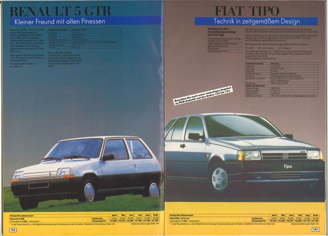 Fiat Regata: Fiat leverde eerst vooral de 131 aan de DDR, later ook Uno’s en Regata’s. Als tussenhandelaar diende de slimme West-Berlijnse Fiat-dealer Foti, die direct aan Intershop en Genex leverde. De Regata, de chique sedan-versie van de toen al eens opgefriste Ritmo, was in vergelijking met de 131 een stuk moderner met zijn voorwielaandrijving en dwarsgeplaatste motoren.