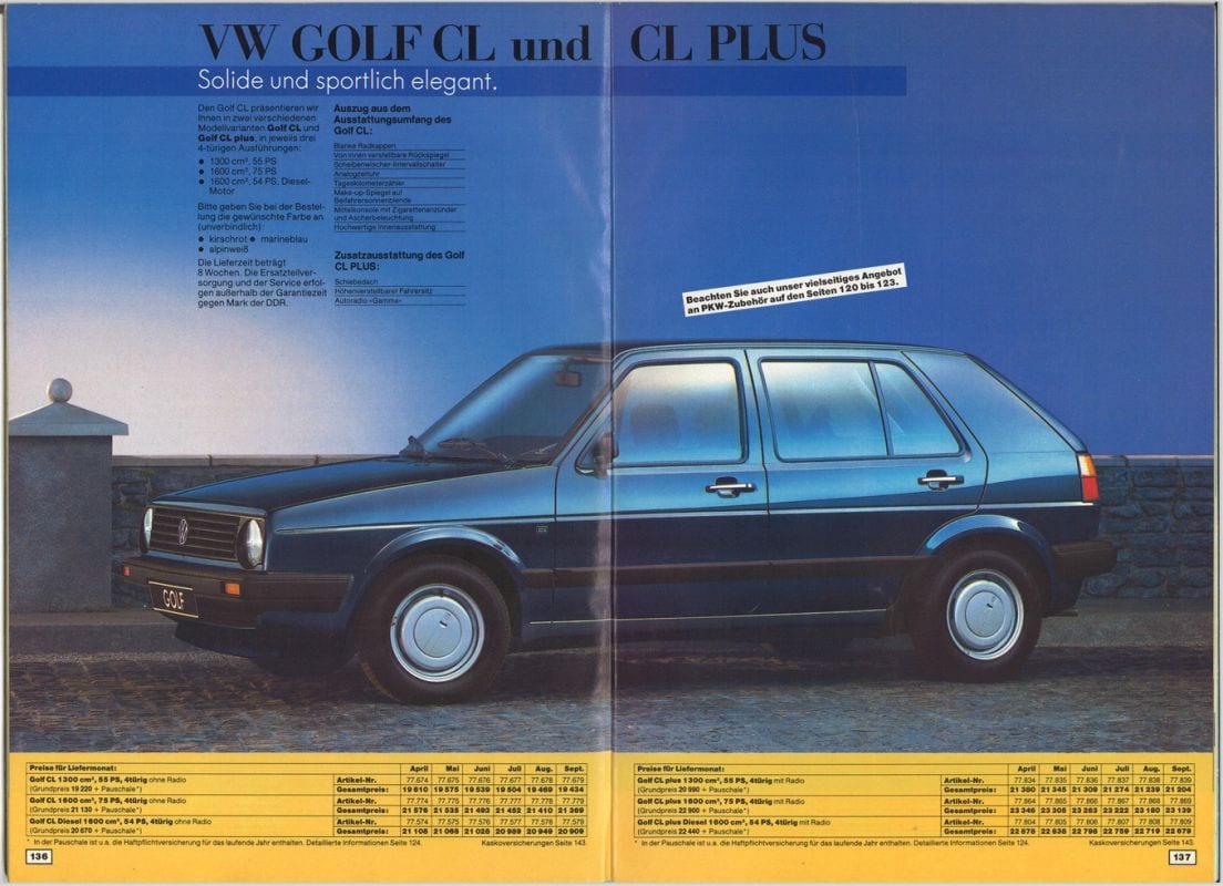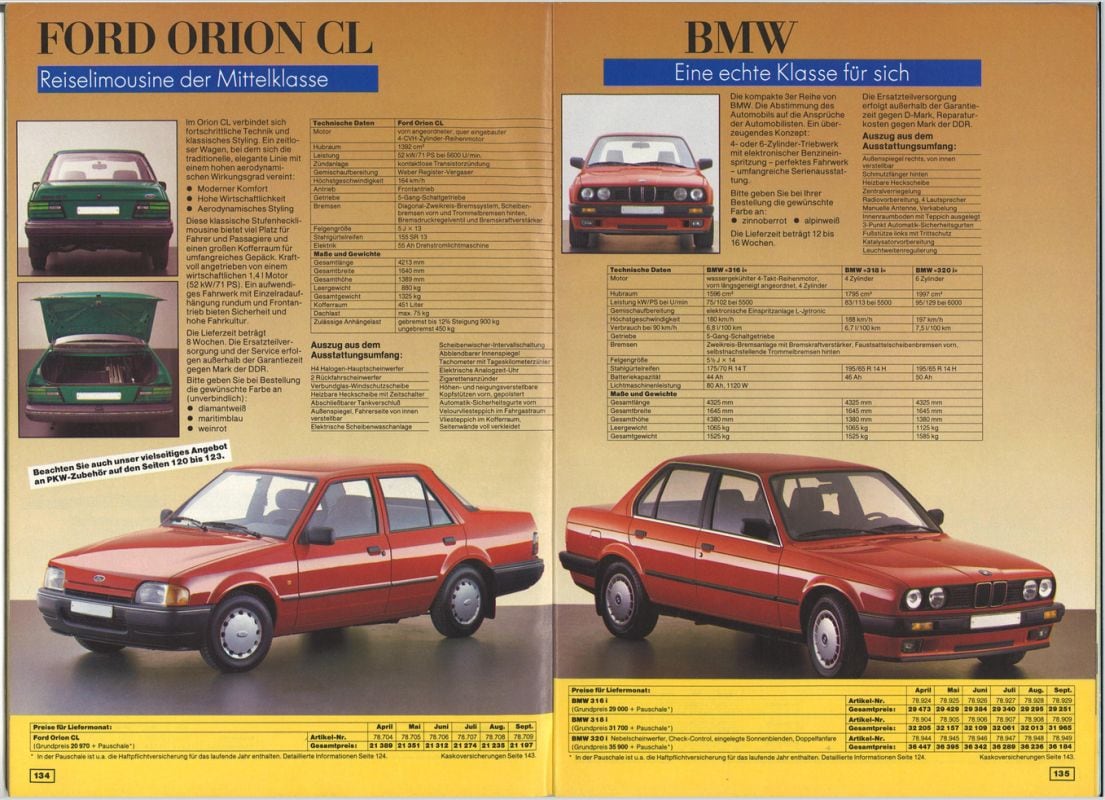 Zelfs BMW’s waren leverbaar in de DDR! De Genex-brochure toont de BMW 3-serie, dat is in de jaren 80 de generatie die als E30 bekendstaat. Kopers konden van 29.000 DM een 316i kopen, maar een 318i en zelfs de 320i met zescilinder stonden ook in de catalogus. Die laatste begon bij 35.900 DM.