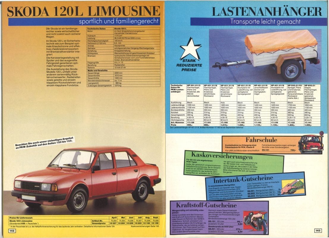 Bij Genex stonden ook veel DDR-producten in de catalogus, zoals radio’s van RFT, camera’s van Praktica en boormachines van Multimax. Dat was natuurlijk een knap staaltje flessentrekkerij: eerst werd het productaanbod in de DDR gereduceerd, waardoor veel producten schaars werden. Vervolgens kon je die zaken voor Westers geld weer kopen bij Genex. Het hoogtepunt van de kleurrijke catalogus was zonder twijfel het autogedeelte, dat circa 70 procent van de pagina’s in beslag nam. Ook hierin bevonden zich veel modellen uit communistische landen, zoals de Barkas (een busje, dat vanaf DM 17.155 kostte) of een Skoda 120 L (DM 12.975). Een Trabant kostte begin 1989 vanaf DM 5.375, terwijl een Wartburg 1.3 met viertaktmotor met DM 14.530 een stuk duurder was. Bijzonder was dat deze modellen al binnen een paar weken werden geleverd en niet, zoals gebruikelijk was voor bijvoorbeeld een Trabant, pas na twaalf tot vijftien jaar. Echt, zo lang moesten de mensen wachten die niet over westers geld beschikten.