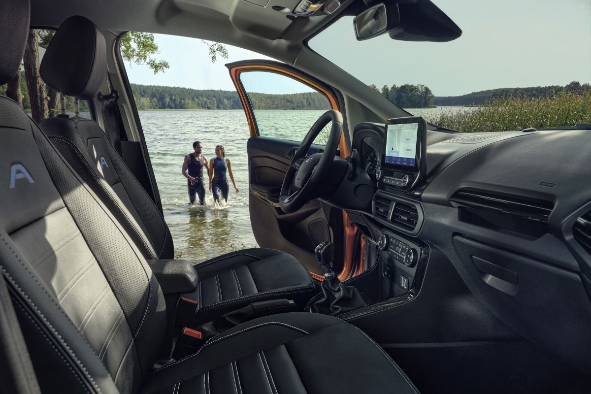 Ook vanbinnen komt het Active-feestje tot uiting, zij het in iets mindere mate dan aan de buitenkant. Het onderscheid zit hem vooral in een rijkere standaarduitrusting. De cross-over krijgt onder meer automatische verlichting, een regensensor, klimaatregeling, cruisecontrol en elektrisch bedienbare ruiten voor en achter. Ook zijn parkeersensoren achter standaard, hetzelfde geldt voor een infotainmentsysteem met 8-inch touchscreen en een audiosysteem met zes luidsprekers. Het oog wil natuurlijk ook wat, dus krijgt de Ecosport Active lederen bekleding met blauwe stiksels. Ook de hamdremgreep, de pookhoes en het stuurwiel zijn met leer bekleed en Ford geeft hem zelfs sfeerverlichting mee.
