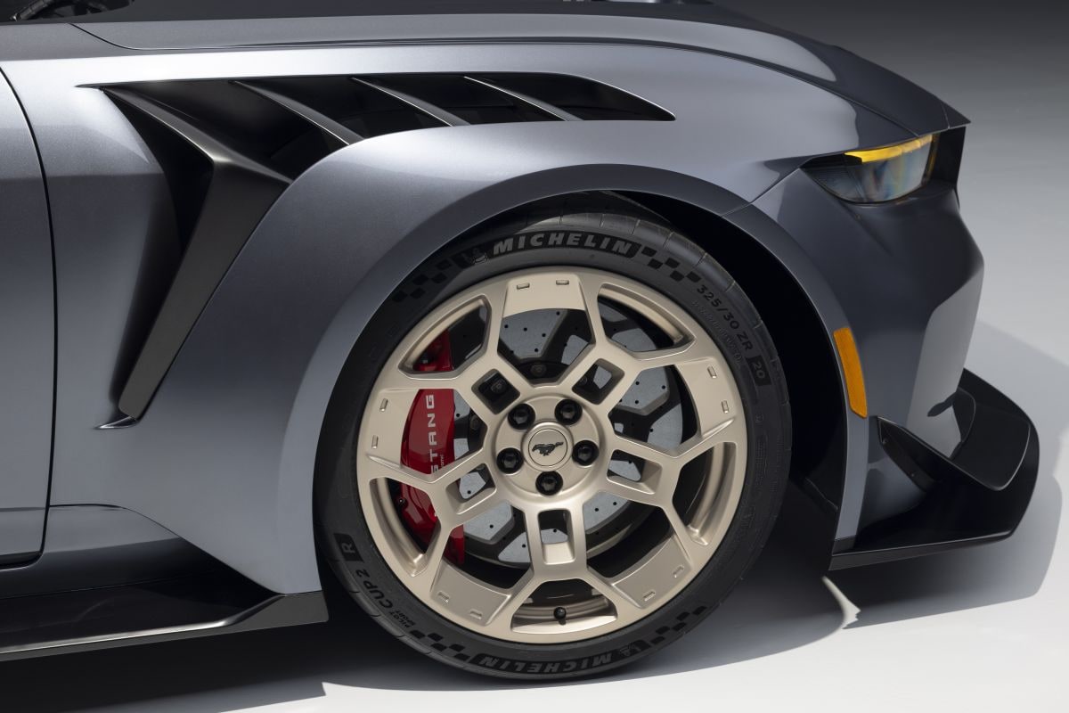 Het mag dan ook geen verrassing zijn dat werkelijk alles is aangepakt voor deze super-Mustang. Het onderstel ging compleet op de schop en bevat veren en dempers die niet alleen in hardheid, maar tevens in hoogte verstelbaar zijn. Zo staat hij in ‘track mode’ bijna 40 mm dichterbij het asfalt dan normaal. en achter de 20-inch wielen gaan gigantische remschijven schuil. Ook de banden mogen er zijn: vóór zijn ze al 325 mm breed, achter zelfs 345!