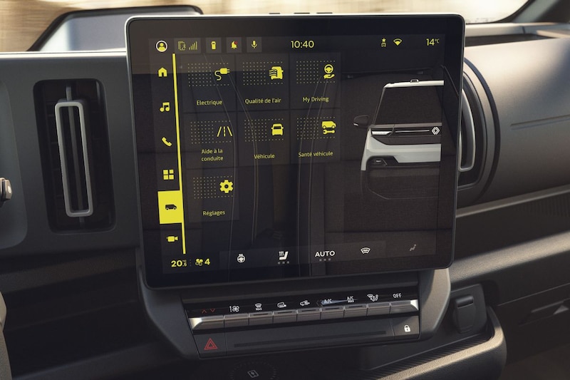 De nieuwe Renault Trafic heeft een opvallend front waarin het Renault-logo, de led-dagrijverlichting en horizontale ledstrepen zijn ondergebracht. De daadwerkelijke koplampen zitten lager in het front. Aan de achterzijde zien we twee achterdeuren en verticaal georiënteerde achterlichten. Het interieur van de nieuwe Renault Trafic hebben we eerder ook al gezien. Er zit een 10-inch digitaal instrumentarium en een 12-inch groot infotainmentscherm in. Het geheel is enigszins om de bestuurder gevormd. We zien verticale uitstroomopeningen van het ventilatiesysteem en opgesplitste A-stijlen die bevorderlijk moeten zijn voor het zicht rondom. Het binnenste is volgestopt met opbergvakken en bekerhouders. Handig!