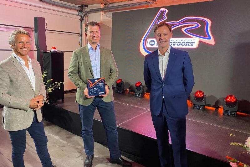 De trotse CEO van CM.com (midden) met Jan Lammers en circuitdirecteur Robert van Overdijk